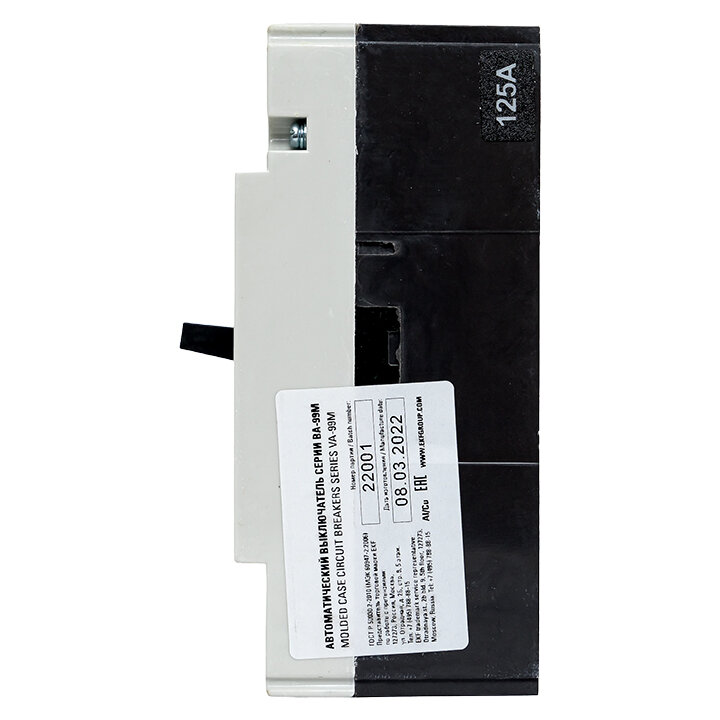 Выключатель ВА-99М выполнен в виде моноблока и состоит из основания и крышки с фальшпанелью, в которой имеется окно для рукоятки управления и толкатель кнопки «Тест» - проверки механизма отключения выключателя. Основание выполнено из термостойкой пластмассы, не поддерживающей горение и являющейся несущей конструкцией для присоединительных зажимов, неподвижных и подвижных контактов с системой дугогашения, механизма управления, блока защиты от сверхтоков. Крышка закрывает все подвижные элементы механизма управления и внутренние токоведущие части.