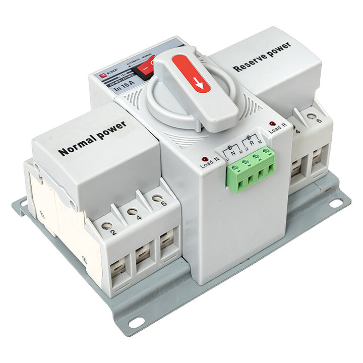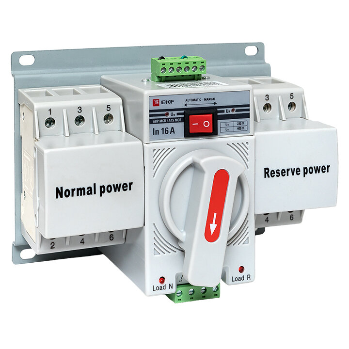 Устройство АВР EKF предназначено для обеспечения резервным электроснабжением нагрузки, подключенной к системе электрообеспечения, имеющей основной и резервный вводы. Устройство АВР автоматически подключает резервную линию питания в случае исчезновения напряжения на основной линии. Предназначен для трехфазных четырехпроводных (или однофазных однопроводных) систем двойного энергопитания переменного тока с частотой 50/60 Гц, номинальным напряжением 400 В/230 В и номинальным током до 63А. Устройство выполнено в виде моноблока и состоит из блока управления и двух модульных автоматических выключателей. На блоке управления имеется рычаг ручного переключения. Такая конструкция позволяет уменьшить габариты и площадь установки АВР.