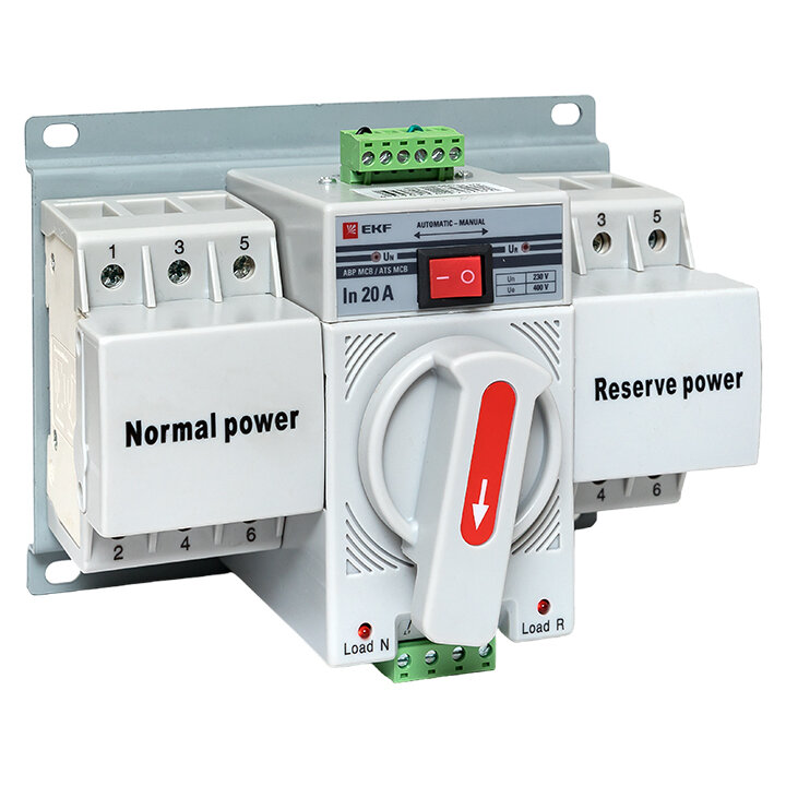 Устройство АВР EKF предназначено для обеспечения резервным электроснабжением нагрузки, подключенной к системе электрообеспечения, имеющей основной и резервный вводы. Устройство АВР автоматически подключает резервную линию питания в случае исчезновения напряжения на основной линии. Предназначен для трехфазных четырехпроводных (или однофазных однопроводных) систем двойного энергопитания переменного тока с частотой 50/60 Гц, номинальным напряжением 400 В/230 В и номинальным током до 63А. Устройство выполнено в виде моноблока и состоит из блока управления и двух модульных автоматических выключателей. На блоке управления имеется рычаг ручного переключения. Такая конструкция позволяет уменьшить габариты и площадь установки АВР.