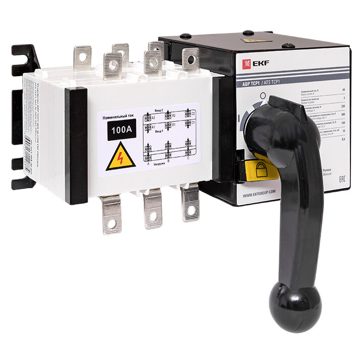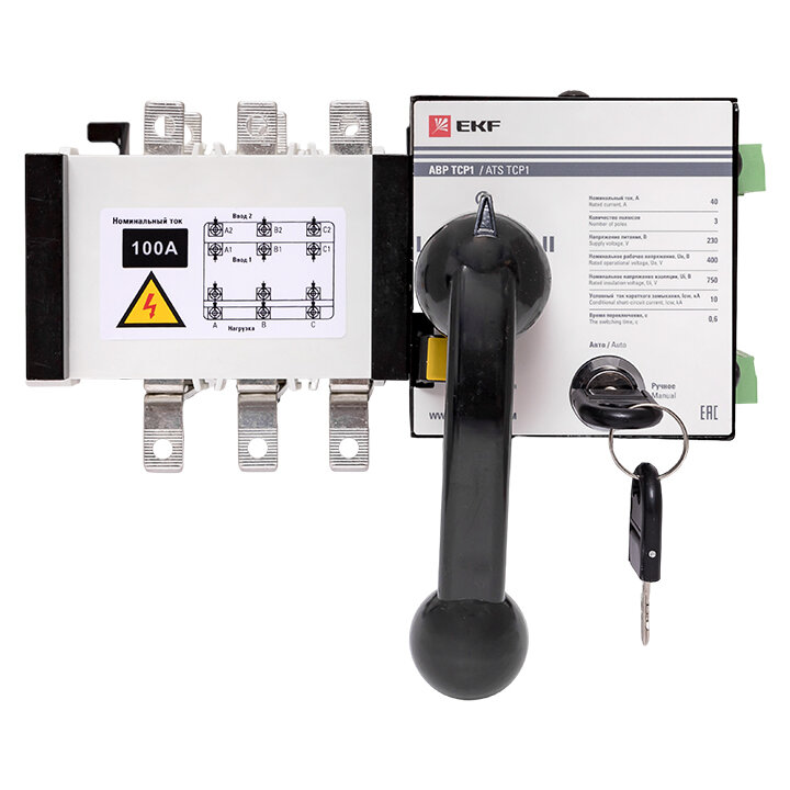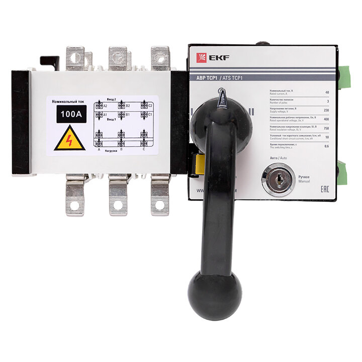 Устройство АВР EKF предназначено для обеспечения резервным электроснабжением нагрузки, подключенной к системе электрообеспечения, имеющей основной и резервный вводы. Устройство АВР автоматически подключает резервную линию питания в случае исчезновения напряжения на основной линии. Предназначен для трехфазных четырехпроводных (или однофазных однопроводных) систем двойного энергопитания переменного тока с частотой 50/60 Гц, номинальным напряжением 400 В/230 В и номинальным током до 63А. Устройство выполнено в виде моноблока и состоит из блока управления и двух модульных автоматических выключателей. На блоке управления имеется рычаг ручного переключения. Такая конструкция позволяет уменьшить габариты и площадь установки АВР.